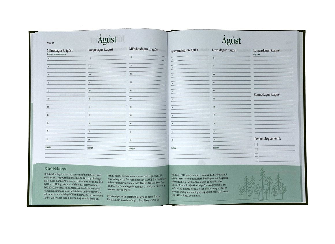 Sjálfbærnidagbókin 2026 - sú fyrsta sinnar tegundar á Íslandi. Einstök dagbók sem sameinar hefðbundið skipulag með vikulegum fróðleiksmolum og verkefnum um sjálfbærni.